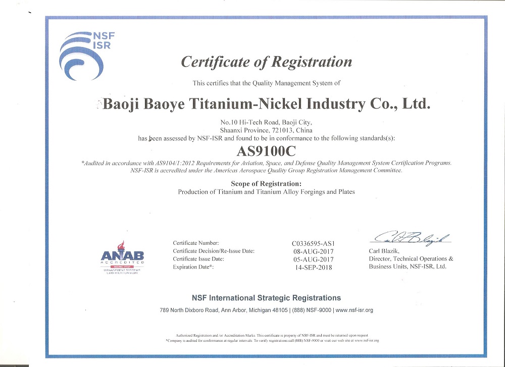 AS9100C熱烈祝賀寶雞寶冶鈦鎳取得航空航天質(zhì)量管理體系認(rèn)證