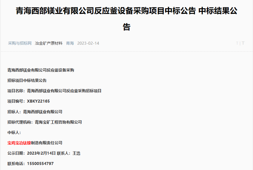 2023年一季度寶冶鈦鎳制造有限責(zé)任公司連續(xù)中標(biāo)約計(jì)2000萬(wàn)元合同